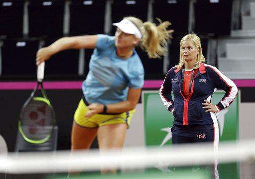 United States' team captain Kathy Rinaldi, right, looks on as United States' Coco Vandeweghe serves the ball during a training session, in Aix-en-Provence, Friday, April 20, 2018. The Fed Cup semifinal matches between France and USA will take place Saturday and next Sunday. (AP Photo/Claude Paris)