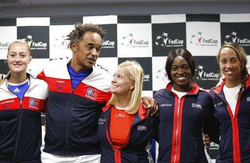 Left to right, France's Team members Kristina Mladenovic, captain Yannick Noah and United States' Fed Cup team members, captain Kathy Rinaldi, Sloane Stephens, Madison Keys, pose for photo after the draw ceremony in Aix-en-Provence, Friday, April 20, 2018. The Fed Cup semifinal matches between France and USA will take place Saturday and next Sunday. (AP Photo/Claude Paris)