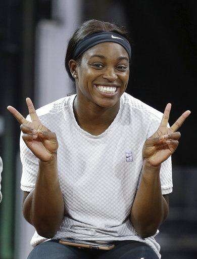 United States' Sloane Stephens gestures as she attends a training session, in Aix-en-Provence, Friday, April 20, 2018. The Fed Cup semifinal matches between France and USA will take place Saturday and next Sunday. (AP Photo/Claude Paris)