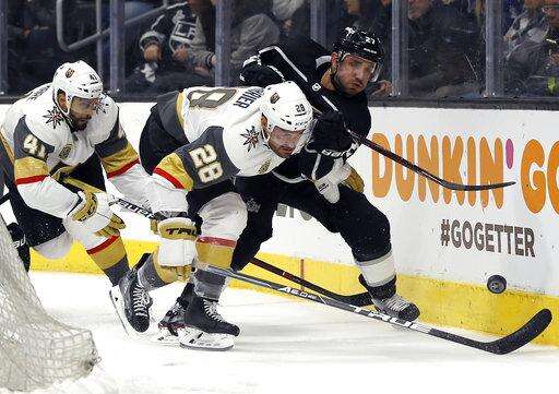 Los Angeles Kings defenseman Alec Martinez, right, competes for the puck with Vegas Golden Knights left wing William Carrier, center, and left wing Pierre-Edouard Bellemare, left, of France, during the third period of Game 4 of an NHL hockey first-round playoff series in Los Angeles, Tuesday, April 17, 2018. Vegas won 1-0, becoming the first expansion team in NHL history to sweep its first playoff series. (AP Photo/Alex Gallardo) The Associated Press