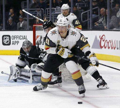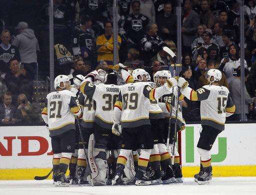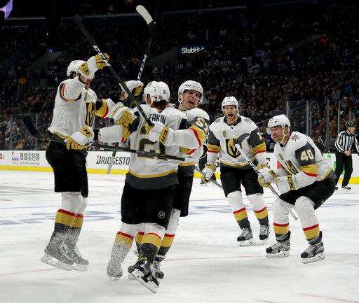 FILE - In this April 15, 2018, file photo, Vegas Golden Knights center Cody Eakin (21) celebrates after scoring against the Los Angeles Kings during the third period of Game 3 of an NHL hockey first-round playoff series in Los Angeles. The Golden Knights are the first new team in the NHL's modern era to have a winning record in their inaugural season, a period that began in 1967 and encompasses 26 new franchises (including one, the ill-fated California Seals, who are no longer around).(AP Photo/Chris Carlson, File) The Associated Press