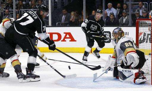 A shot by Los Angeles Kings center Jeff Carter, second from left, gets in front of Vegas Golden Knights goaltender Marc-Andre Fleury, right, on a centering pass from center Tobias Rieder (10), of Germany, during the second period of Game 4 of an NHL hockey first-round playoff series in Los Angeles, Tuesday, April 17, 2018. (AP Photo/Alex Gallardo) The Associated Press