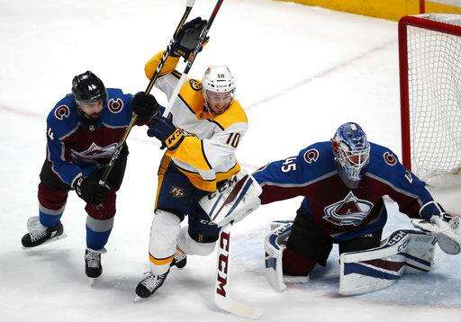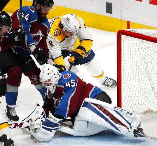 Nashville Predators center Colton Sissons, center, fights to pursue the puck between Colorado Avalanche defenseman Mark Barberio, left, and goaltender Jonathan Bernier during the first period of Game 4 of an NHL hockey first-round playoff series Wednesday, April 18, 2018, in Denver. (AP Photo/David Zalubowski) The Associated Press