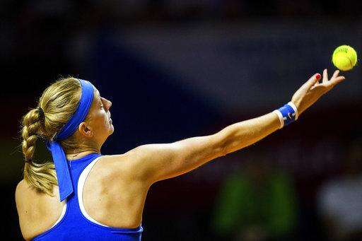Czech Republic's Petra Kvitova returns a shot to Julia Goerges during a single match of the tennis Fed Cup semifinal between Germany and Czech Republic in Stuttgart, Germany, Saturday, April 21, 2018. (Thomas Niedermueller/dpa via AP)