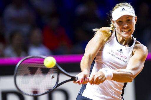 Germany's Angelique Kerber returns a shot to Czech Republic's Karolina Pliskova during the tennis Fed Cup semifinal between Germany and Czech Republic in Stuttgart, Germany, Saturday, April 21, 2018. (Thomas Niedermueller/dpa via AP)