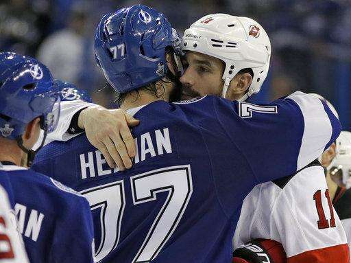 New Jersey Devils center Brian Boyle (11) hugs Tampa Bay Lightning defenseman Victor Hedman (77) after the Lightning eliminated the Devils with a 3-1 win during Game 5 of an NHL first-round hockey playoff series Saturday, April 21, 2018, in Tampa, Fla. (AP Photo/Chris O'Meara) The Associated Press
