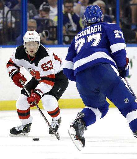 New Jersey Devils left wing Jesper Bratt (63) carries the puck at Tampa Bay Lightning defenseman Ryan McDonagh (27) during the first period of Game 5 of an NHL first-round hockey playoff series Saturday, April 21, 2018, in Tampa, Fla. (AP Photo/Chris O'Meara) The Associated Press