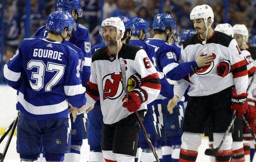 New Jersey Devils defenseman Andy Greene (6) congratulates Tampa Bay Lightning center Yanni Gourde (37) after the Lightning eliminated the Devils during Game 5 of an NHL first-round hockey playoff series Saturday, April 21, 2018, in Tampa, Fla. (AP Photo/Chris O'Meara) The Associated Press
