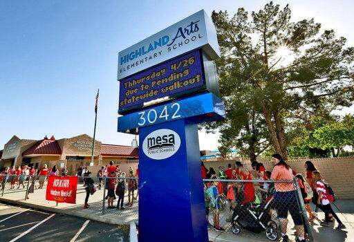 A sign tells of a pending walk-out as teachers from Highland Arts Elementary School, parents and students arrive for classes Wednesday, April 25, 2018, in Mesa, Ariz. Communities and school districts are preparing for a historic statewide teacher walkout on Thursday that could keep hundreds of thousands of students out of school indefinitely. (AP Photo/Matt York) The Associated Press