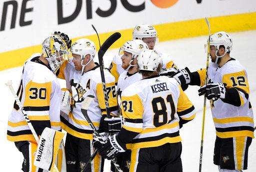 Pittsburgh Penguins goaltender Matt Murray (30) celebrates with right wing Patric Hornqvist (72), of Sweden; right wing Phil Kessel (81); center Dominik Simon (12); and others after Game 1 of an NHL second-round hockey playoff series against the Washington Capitals, Thursday, April 26, 2018, in Washington. The Penguins won 3-2. (AP Photo/Nick Wass) The Associated Press