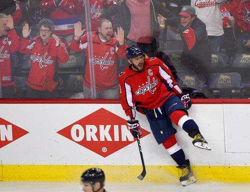 Washington Capitals left wing Alex Ovechkin, of Russia, celebrates his goal during the third period in Game 1 of an NHL second-round hockey playoff series against the Pittsburgh Penguins, Thursday, April 26, 2018, in Washington. The Penguins won 3-2. (AP Photo/Nick Wass) The Associated Press