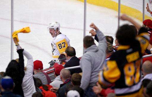 Pittsburgh Penguins center Sidney Crosby (87) celebrates his goal during the third period in Game 1 of an NHL second-round hockey playoff series against the Washington Capitals, Thursday, April 26, 2018, in Washington. The Penguins won 3-2. (AP Photo/Nick Wass) The Associated Press