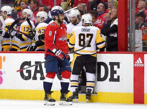 Washington Capitals left wing Alex Ovechkin (8), of Russia, skates against Pittsburgh Penguins center Sidney Crosby (87) during the third period in Game 1 of an NHL second-round hockey playoff series, Thursday, April 26, 2018, in Washington. The Penguins won 3-2. (AP Photo/Nick Wass) The Associated Press