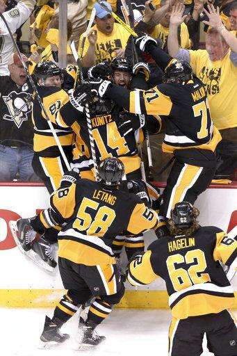FILE - In this May 10, 2016, file photo, Pittsburgh Penguins' Nick Bonino (13), center, is mobbed by teammates after scoring the game winning goal against the Washington Capitals during overtime of Game 6 of the NHL hockey Stanley Cup Eastern Conference semifinals, in Pittsburgh. The Penguins and Capitals are facing off in the second round for the third consecutive year with the cast of characters changing only slightly along the way. (AP Photo/Gene J. Puskar, File) The Associated Press