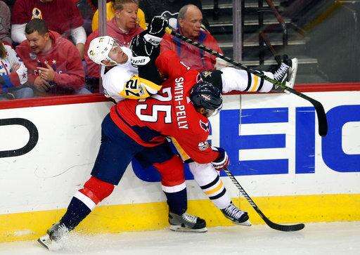 FILE - In this Nov. 10, 2017, file photo, Washington Capitals right wing Devante Smith-Pelly (25) checks Pittsburgh Penguins right wing Patric Hornqvist (72), of Sweden, into the boards during the third period of an NHL hockey game, in Washington. The Penguins and Capitals are facing off in the second round for the third consecutive year. (AP Photo/Nick Wass, File) The Associated Press