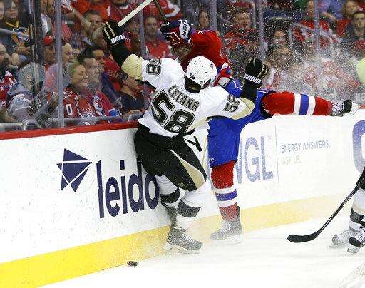 FILE - In this April 7, 2016, file photo, Pittsburgh Penguins defenseman Kris Letang (58) and Washington Capitals right wing T.J. Oshie (77) collide against the boards in the first period of an NHL hockey game, in Washington. Like tourists flocking to see the cherry blossoms in full bloom, the Pittsburgh Penguins making a trip to Washington for the playoffs has become a rite of spring. (AP Photo/Alex Brandon, File) The Associated Press