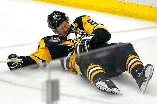 FILE - In this May 1, 2017, file photo, Pittsburgh Penguins' Sidney Crosby (87) lies on the ice after taking a hit from Washington Capitals' Matt Niskanen during the first period of Game 3 in an NHL Stanley Cup Eastern Conference semifinal hockey game against the Washington Capitals in Pittsburgh. The Penguins and Capitals are facing off in the second round for the third consecutive year with the cast of characters changing only slightly along the way. (AP Photo/Gene J. Puskar, File) The Associated Press