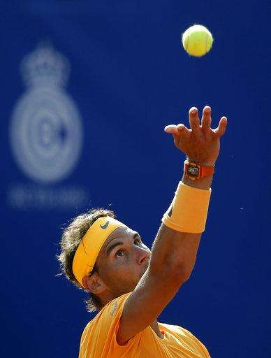 Rafael Nadal, of Spain, servers the ball to Martin Klizan, of Slovakia, during the Barcelona Open tennis tournament in Barcelona, Spain, Friday, April 27, 2018. (AP Photo/Manu Fernandez) The Associated Press