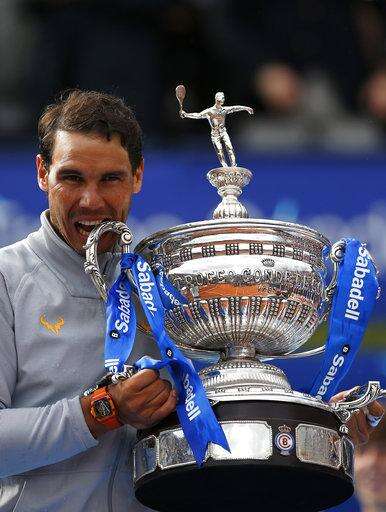 Spain's Rafael Nadal holds his trophy after winning the Barcelona Open Tennis Tournament final in Barcelona, Spain, Sunday, April 29, 2018. Nadal defeated Greece's Stefanos Tsitsipas 6-2, 6-1 in the final. (AP Photo/Manu Fernandez) The Associated Press