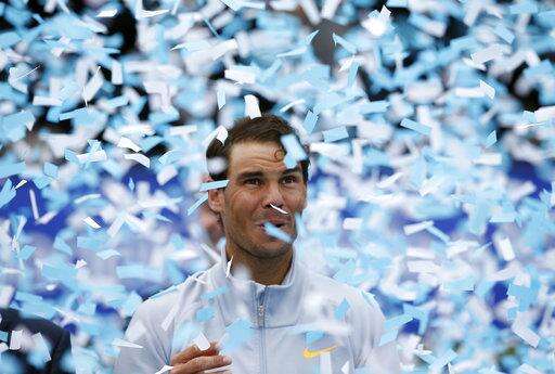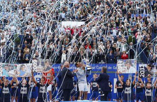 Spain's Rafael Nadal reacts to falling confetti after winning the Barcelona Open Tennis Tournament final in Barcelona, Spain, Sunday, April 29, 2018. Nadal defeated Greece's Stefanos Tsitsipas 6-2, 6-1 in the final. (AP Photo/Manu Fernandez) The Associated Press