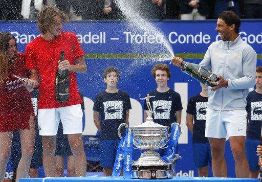 Spain's Rafael Nadal, right, sprays sparkling wine on Greece's Stefanos Tsitsipas after winning the Barcelona Open Tennis Tournament final in Barcelona, Spain, Sunday, April 29, 2018. Nadal defeated Greece's Stefanos Tsitsipas 6-2, 6-1 in the final. (AP Photo/Manu Fernandez) The Associated Press