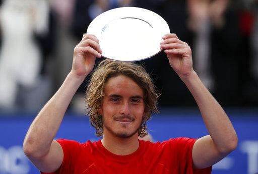 Greece's Stefanos Tsitsipas holds his second place trophy after the Barcelona Open Tennis Tournament final in Barcelona, Spain, Sunday, April 29, 2018. Spain's Rafael Nadal defeated Tsitsipas 6-2, 6-1 in the final. (AP Photo/Manu Fernandez) The Associated Press