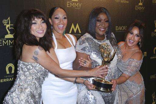 Jeannie Mai, from left, Tamera Mowry-Housley, Loni Love and Adrienne Houghton pose in the press room with the award for outstanding entertainment talk show host for "The Real" at the 45th annual Daytime Emmy Awards at the Pasadena Civic Center on Sunday, April 29, 2018, in Pasadena, Calif. (Photo by Willy Sanjuan/Invision/AP)
