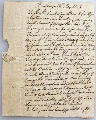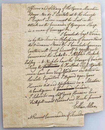 This 2018 photo provided by Fort Ticonderoga shows an original letter Ethan Allen sent to the governor of Connecticut on May 12, 1775, at Fort Ticonderoga, in Ticonderoga, N.Y. The letter, dated two days after Ethan Allen and his Green Mountain Boys, along with Connecticut militia officer Benedict Arnold, captured British-held Fort Ticonderoga in northern New York, will be exhibited at the fort, along with a lock of Arnold's hair. (Margaret Staudter/Fort Ticonderoga via AP) The Associated Press