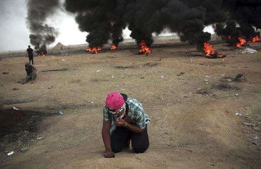 Palestinian protesters react from teargas fired by Israeli troops during a protest at the Gaza Strip's border with Israel, Friday, May 4, 2018. (AP Photo/ Khalil Hamra) The Associated Press