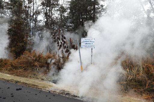 Volcanic gas streams out of a vent around a sign in the Leilani Estates, Saturday, May 5, 2018, in Pahoa, Hawaii. The Hawaiian Volcanoes Observatory said eight volcanic vents opened in the Big Island residential neighborhood of Leilani Estates since Thursday. (AP Photo/Marco Garcia) The Associated Press