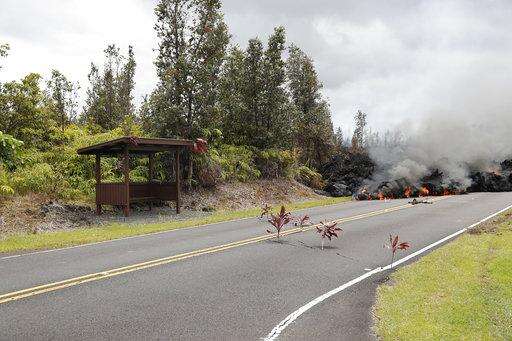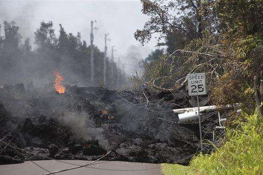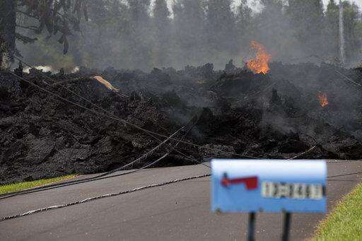 Lava from the Kilauea volcano moves across the road in the Leilani Estates in Pahoa, Hawaii, Saturday, May 5, 2018. Hundreds of anxious residents on the Big Island of Hawaii hunkered down Saturday for what could be weeks or months of upheaval as the dangers from an erupting Kilauea volcano continued to grow. (AP Photo/Marco Garcia) The Associated Press