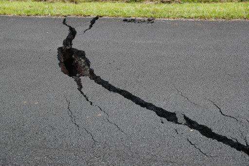 Large cracks from an earthquake are seen in a road in the Leilani Estates subdivision, Saturday, May 5, 2018, in Pahoa, Hawaii. Hundreds of people on the Big Island of Hawaii are hunkering down for what could be weeks or months of upheaval as the dangers from an erupting Kilauea volcano grow. (AP Photo/Marco Garcia) The Associated Press