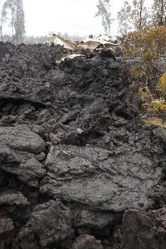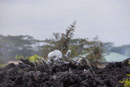A power line and transformer lay on top of a lava flow in the Leilani Estates, Saturday, May 5, 2018, in Pahoa, Hawaii. The Hawaiian Volcanoes Observatory said eight volcanic vents opened in the Big Island residential neighborhood of Leilani Estates since Thursday. The vents initially spewed lava but had calmed down by late Saturday and were only releasing steam and gas. (AP Photo/Marco Garcia) The Associated Press