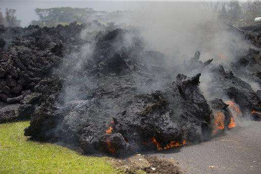 Lava creeps across the road in the Leilani Estates, Saturday, May 5, 2018, in Pahoa, Hawaii. The Hawaiian Volcanoes Observatory said eight volcanic vents opened in the Big Island residential neighborhood of Leilani Estates since Thursday. The Leilani Estates area is at the greatest risk for more lava outbreaks. (AP Photo/Marco Garcia) The Associated Press