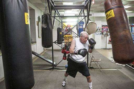In this April 25, 2018, photo, veteran Madison County public defender John Rekowski warms up before sparring at Knuckles Gym in Madison, Ill. Rekowski, whose career in the courtroom spans 30 years also enjoys boxing. He says boxing helps him clear his mind after a long day by forcing him to focus on just one thing. The sport also appeals to his competitive side. (Derik Holtmann/Belleville News-Democrat via AP) The Associated Press
