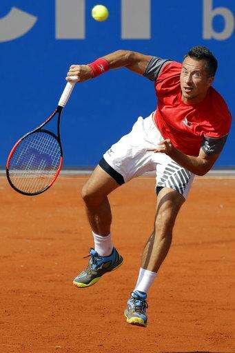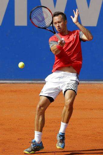 Philipp Kohlschreiber of Germany returns the ball to Germany's Maximilian Marterer during the semifinal match at the ATP tennis tournament in Munich, Germany, Saturday, May 5, 2018. (AP Photo/Matthias Schrader)