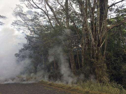 Fumes come out of cracks on the asphalt road near the Leilani Estates in Pahoa, Hawaii, Saturday, May 5, 2018. Hundreds of anxious residents on the Big Island of Hawaii hunkered down Saturday for what could be weeks or months of upheaval as the dangers from an erupting Kilauea volcano continued to grow. Lava spurted from volcanic vents, toxic gas filled the air and strong earthquakes, including a magnitude 6.9 temblor on Friday, rocked an already jittery population. (AP Photo/Marco Garcia)