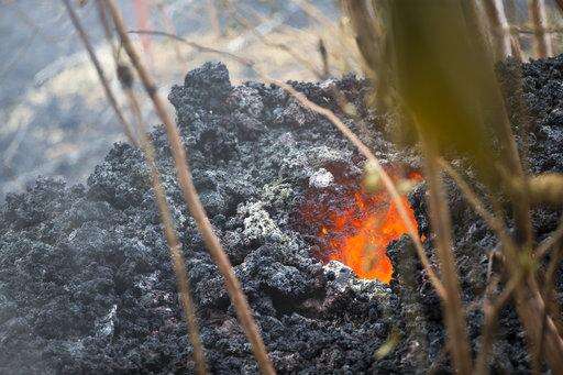 Lava glows from a vent on a lava bed at the Leilani Estates, Saturday, May 5, 2018, in Pahoa, Hawaii. The Hawaiian Volcanoes Observatory said eight volcanic vents opened in the Big Island residential neighborhood of Leilani Estates since Thursday. (AP Photo/Marco Garcia)