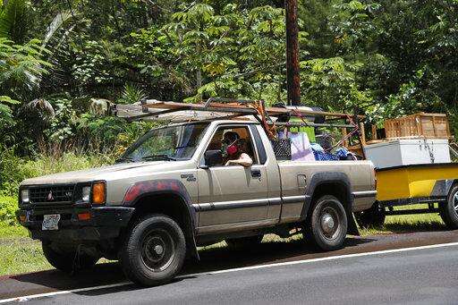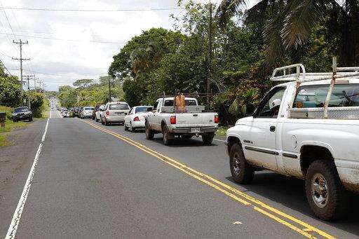 A line of traffic is seen going towards Pahoa town, Sunday, May 6, 2018, near Pahoa, Hawaii. Scientists reported lava spewing more than 200 feet (61 meters) into the air in Hawaii's recent Kilauea volcanic eruption, and some of the more than 1,700 people who evacuated prepared for the possibility they may not return for quite some time. (AP Photo/Marco Garcia)