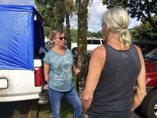 Cherie McArthur and Michael McGuire, who live in the mandatory evacuation zone near Kilauea volcano, talk at a shelter in Pahoa, Hawaii on Sunday, May 6, 2018. Officials on Hawaii's Big Island say what started out as a small spattering of lava from the ground Saturday night only took minutes to become cascading fountains. U.S. Geological Survey volcanologist Wendy Stovall says lava fountains spewed as high as 230 feet (70 meters) into the air only 15 minutes after the initial eruption from a the latest of several new fissures in the area. (AP Photo/Haven Daley)