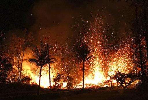 In this Saturday, May 5, 2018 photo, a new fissure erupts in Leilani Estates in Pahoa, Hawaii. Hawaii's erupting Kilauea volcano has destroyed homes and forced the evacuations of more than a thousand people. (U.S. Geological Survey via AP)