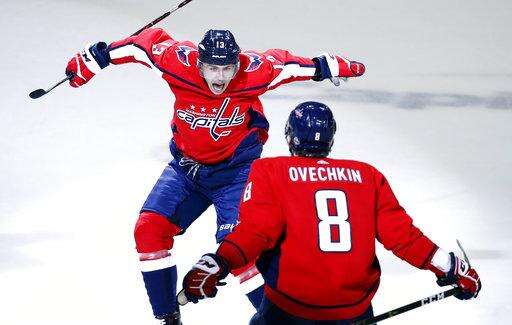 Washington Capitals left wing Jakub Vrana (13), from the Czech Republic, jumps into the arms of left wing Alex Ovechkin (8), from Russia, after scoring the go-ahead goal during the third period of Game 5 in the second round of the NHL Stanley Cup hockey playoffs against the Pittsburgh Penguins, Saturday, May 5, 2018, in Washington. (AP Photo/Alex Brandon) The Associated Press