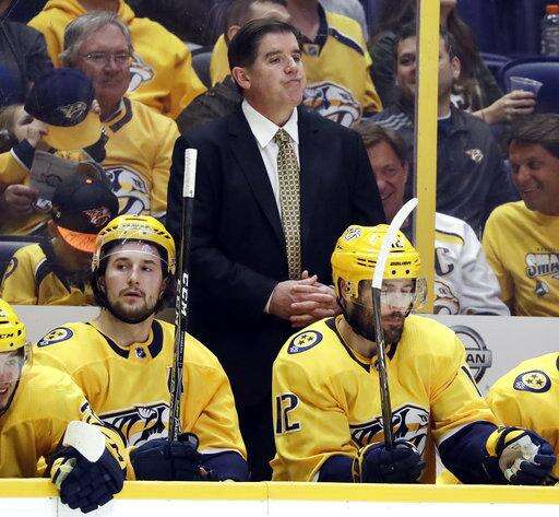 Nashville Predators coach Peter Laviolette watches during the third period in Game 5 of the team's NHL hockey second-round playoff series against the Winnipeg Jets on Saturday, May 5, 2018, in Nashville, Tenn. The Jets won 6-2 to take a 3-2 lead in the series. (AP Photo/Mark Humphrey) The Associated Press