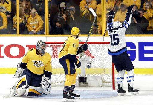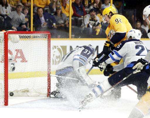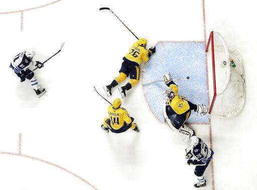 They made up for that in the second. Patrik Laine helped get the Jets on the board with a shot that deflected off Stastny's right hand and past Rinne at 7:44. Defenseman Yannick Weber tied it up for Nashville with a wrister from the left circle at 11:08.