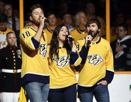 Country music trio Lady Antebellum sings the national anthem before Game 5 of an NHL hockey second-round playoff series between the Nashville Predators and the Winnipeg Jets Saturday, May 5, 2018, in Nashville, Tenn. (AP Photo/Mark Humphrey) The Associated Press