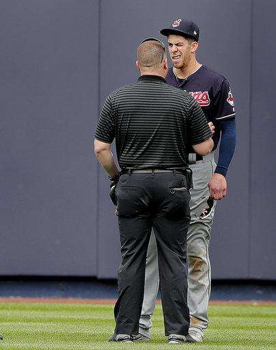 Cleveland Indians center fielder Bradley Zimmer is checked by a trainer after slamming into the wall while trying to catch a ball hit deep by New York Yankees' Austin Romine during the seventh inning of a baseball game, Saturday, May 5, 2018, in New York. Zimmer left the game. (AP Photo/Julie Jacobson) The Associated Press
