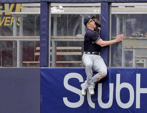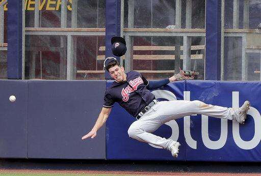 Cleveland Indians center fielder Bradley Zimmer slams into the wall while trying to catch a ball hit deep by New York Yankees' Austin Romine during the seventh inning of a baseball game, Saturday, May 5, 2018, in New York. Romine was credited with a double on the play. (AP Photo/Julie Jacobson) The Associated Press
