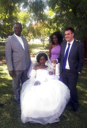 CORRECTS FIRST NAME TO ZENELE FROM ZANELE - In this photo taken on Saturday, May, 5, 2018, Zenele Ndlovu, center, and Jamie Fox hold hands on their wedding day at a hospital Chapel in Bulawayo, Zimbabwe. A couple attacked by a crocodile wedded days later in a Zimbabwean hospital, where the bride was recovering after losing an arm. "In one week we went from shock and agony to a truly amazing experience," Fox told The Associated Press on Monday, May 7. (AP Photo) The Associated Press