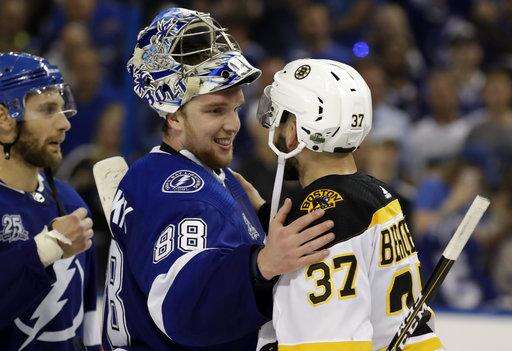 Tampa Bay Lightning goaltender Andrei Vasilevskiy (88) pats Boston Bruins center Patrice Bergeron (37) after Game 5 of an NHL second-round hockey playoff series Sunday, May 6, 2018, in Tampa, Fla. (AP Photo/Chris O'Meara) The Associated Press
