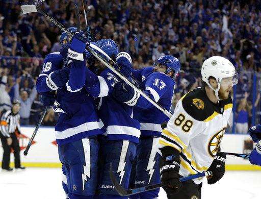Tampa Bay Lightning defenseman Anton Stralman, left, is mobbed by teammates after scoring against the Boston Bruins during the third period of Game 5 of an NHL second-round hockey playoff series Sunday, May 6, 2018, in Tampa, Fla. (AP Photo/Chris O'Meara) The Associated Press
